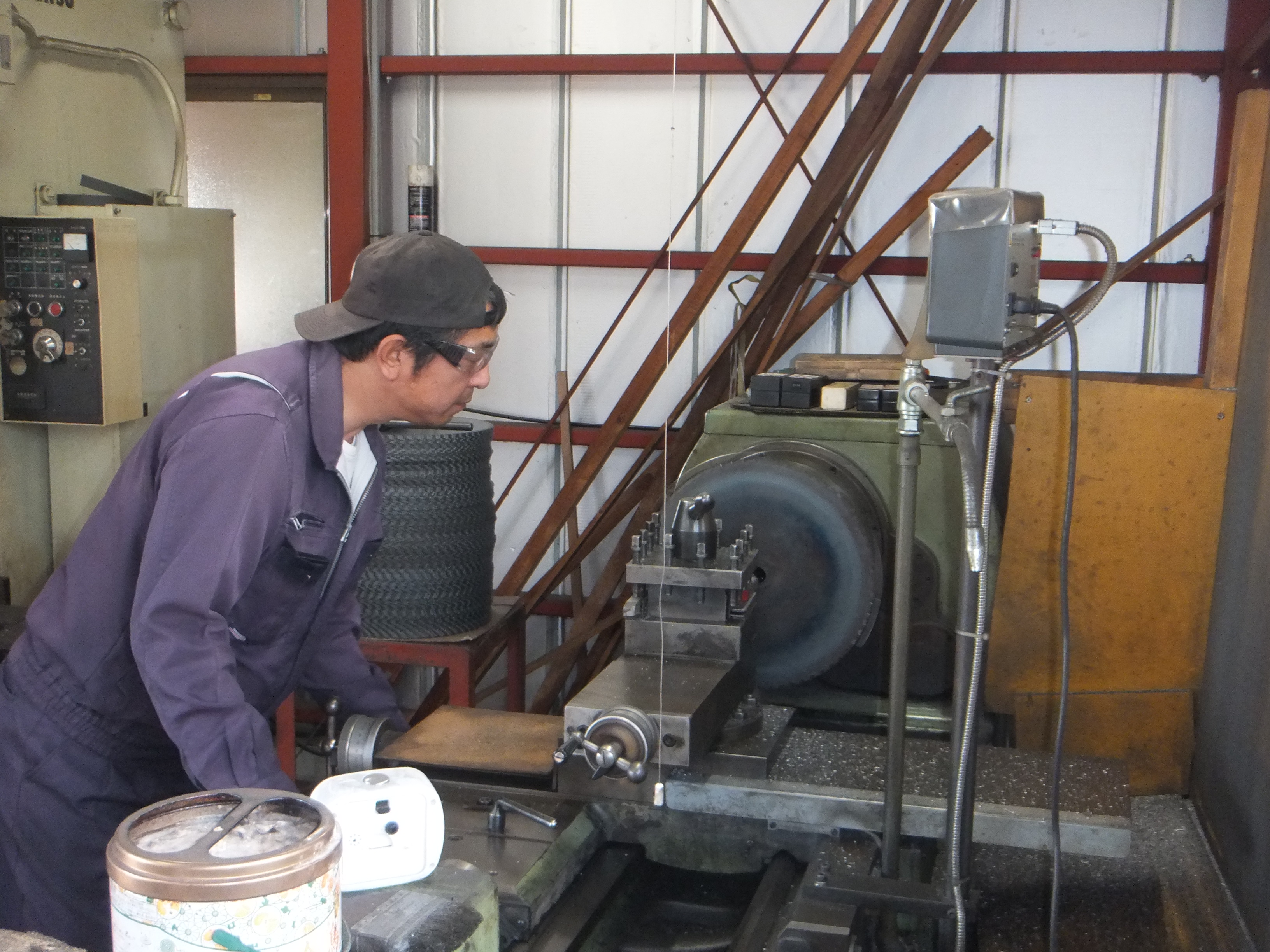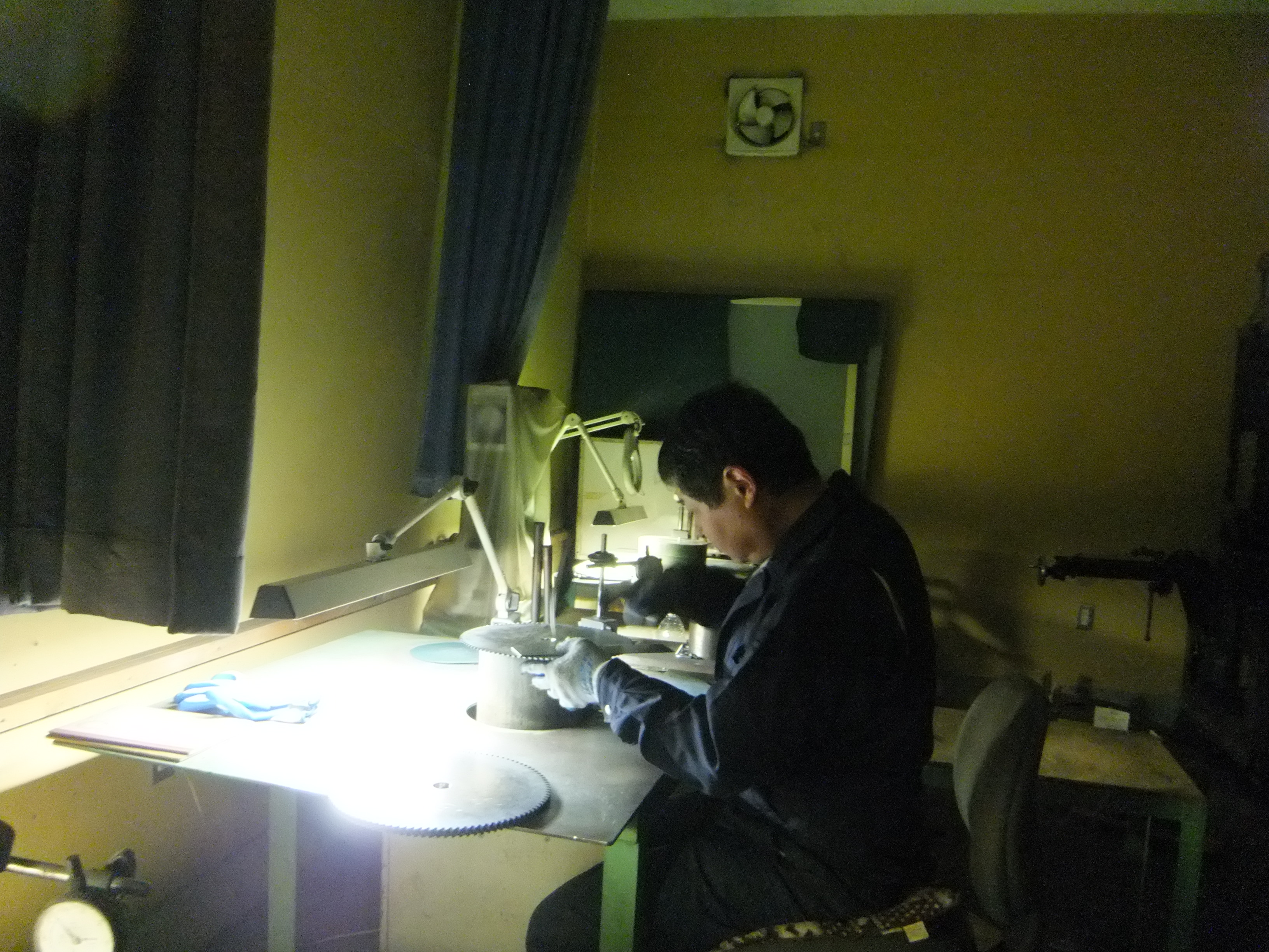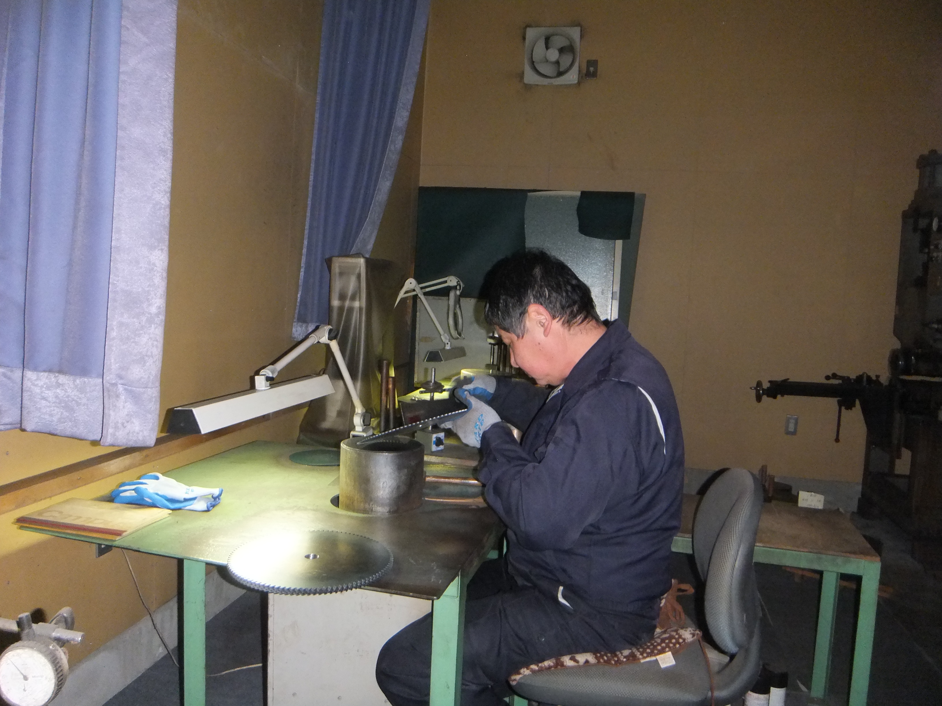 チップソーの製造設備になくてはならない自動研磨機で 側面、スクイ、先端など各一面を研削加工します。 狂いのないよう同時に専用検査機で測定しながら職人が調節をおこないます。 検査機そして目で、一つの狂いも見逃さず、最高の状態を作り出す職人技です。