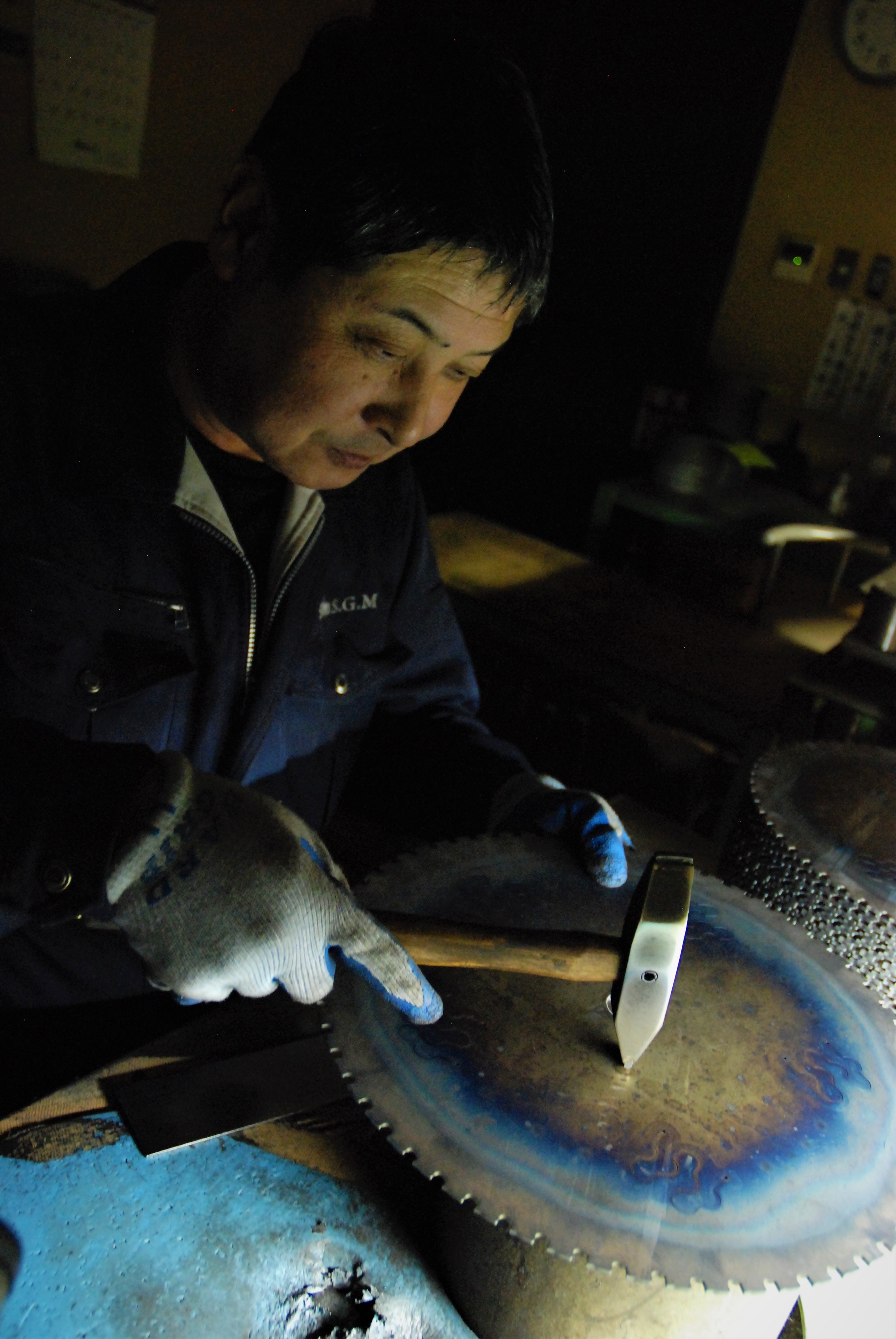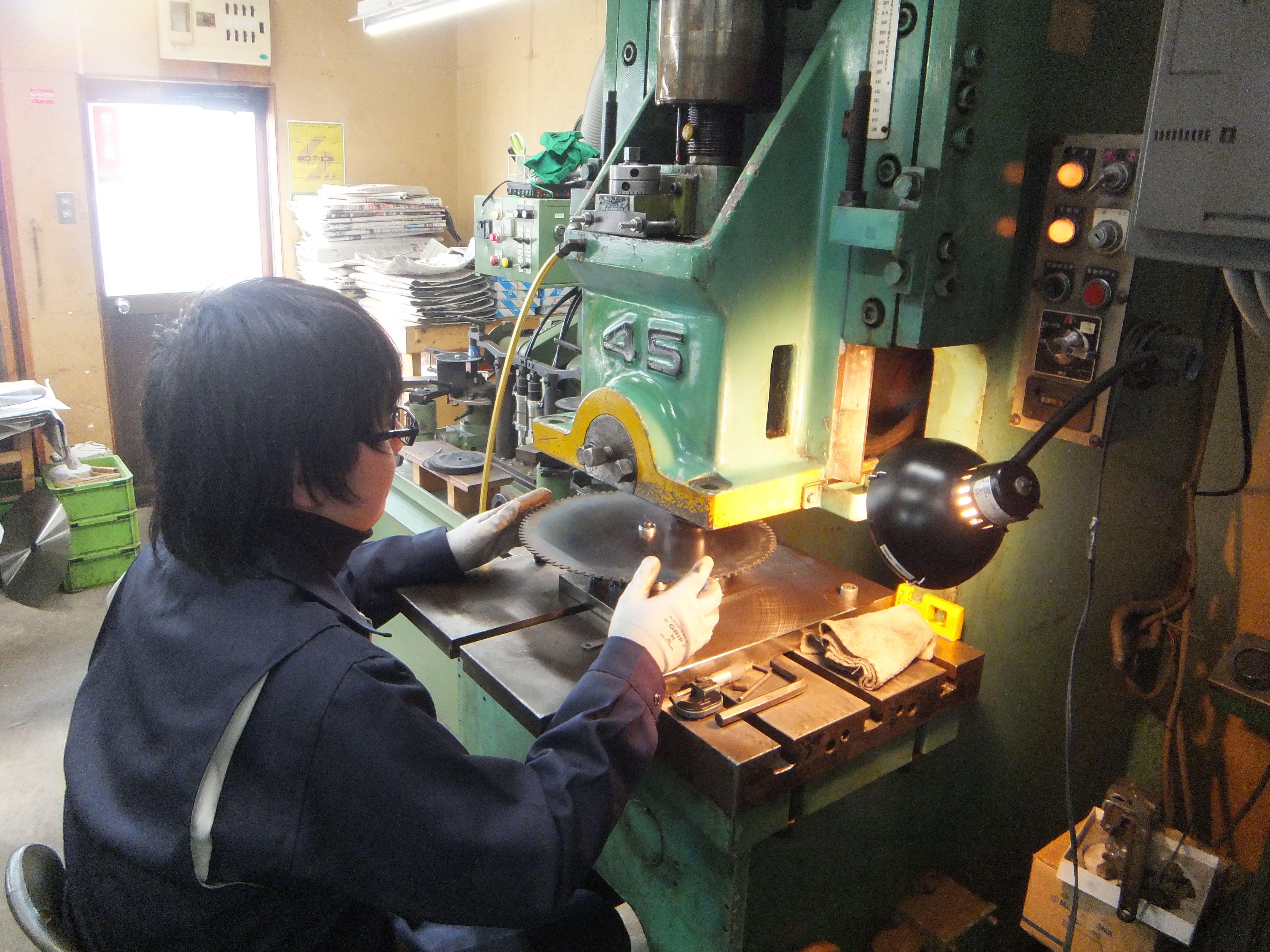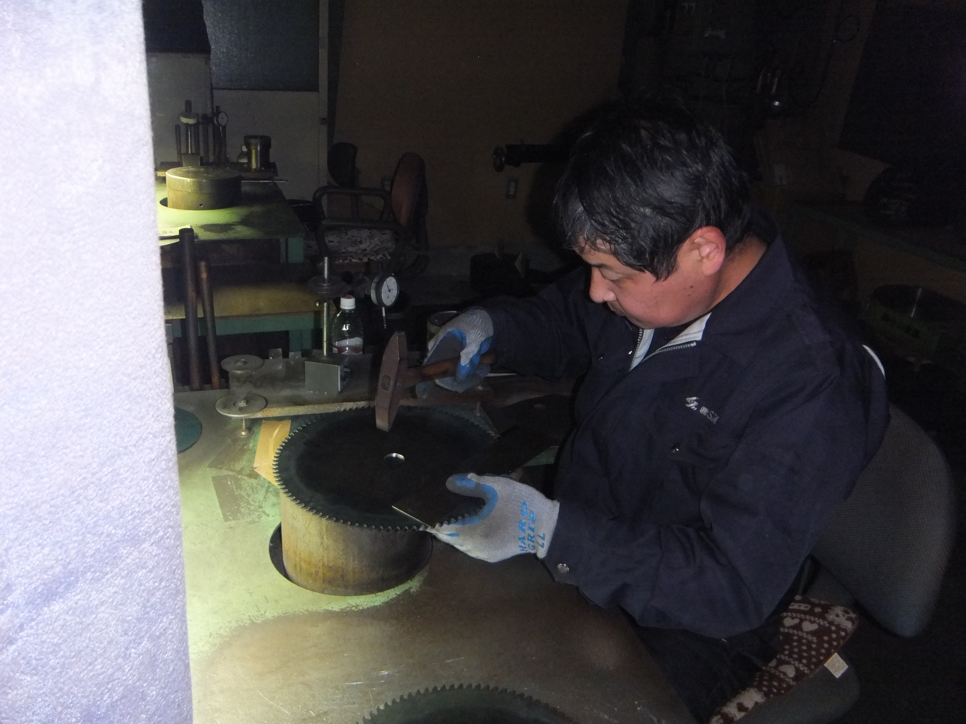 丸鋸は、薄い円盤状の親板の外周に刃具(チップ)を付けた構造のため、板面の面外方向の曲げ剛性はかなり低く振動を生みやすい性質があります。このように低剛性構造の丸鋸を用いて高速切断を行うためには、丸鋸の動的安定性が最も重要な役割を果たしており、この向上が必要とされます。 適切な腰入れ処理をした丸鋸は、工具寿命が飛躍的に伸びます。 このように工具としての性能に重要な役割を担う腰入れ処理を熟練された腰入れ職人がおこない、側面触れを極小水準に抑えています。